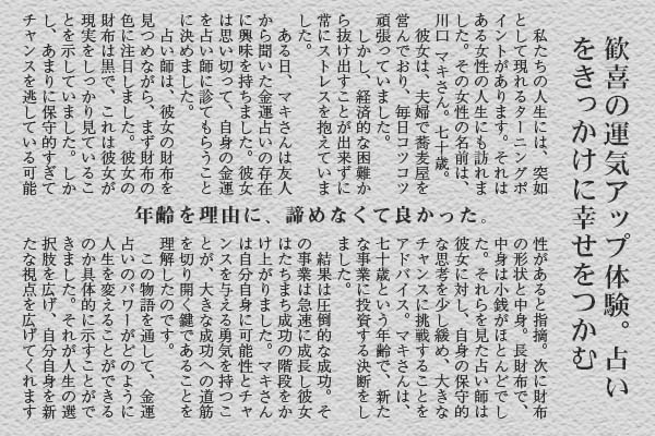 年金生活や身内の不幸で暗かった心が、パッと明るくなりました。